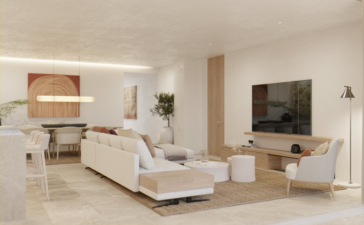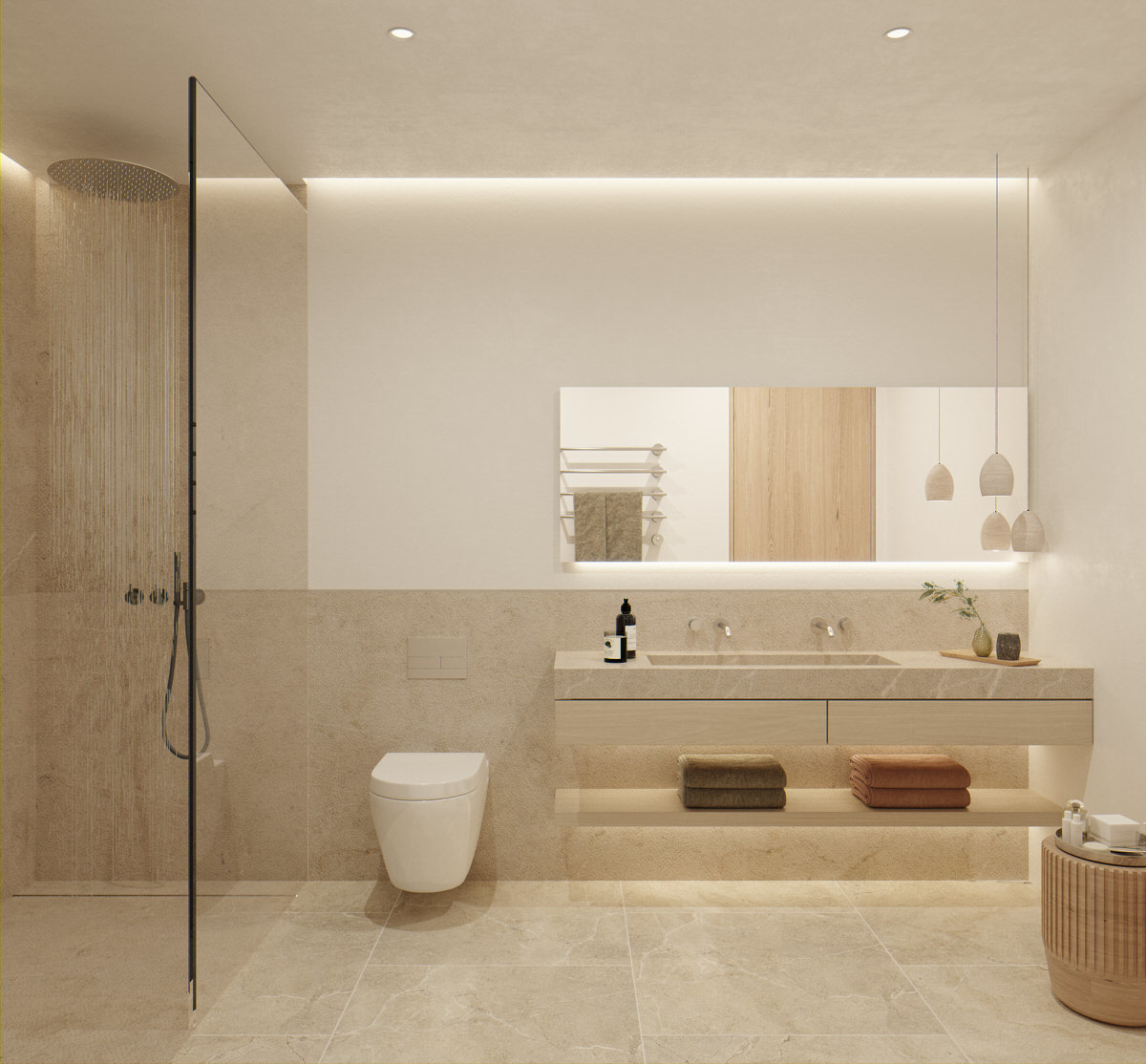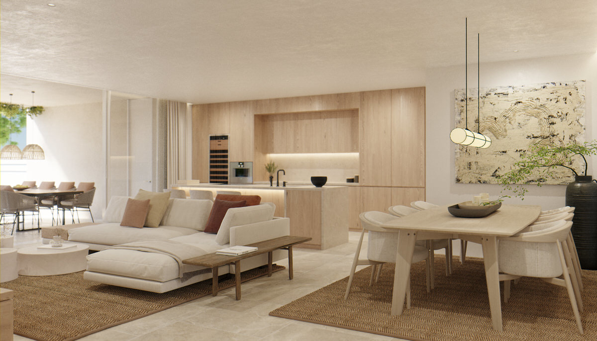 In addition to an open-plan living and dining area with integrated kitchen, the flats each offer two to three bedrooms and two bathrooms. The first-class features include individual kitchens with customised joinery elements, Bosch kitchen appliances, floors with large-format Mediterranean tiles, a modern lighting concept from LLuminic, Cortizo windows and sliding doors in a minimalist design, Iconico designer fittings and Dornbracht bathroom elements. Heat pumps with low energy consumption, underfloor heating and central air conditioning complete the living comfort.