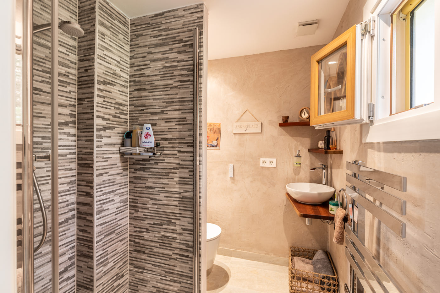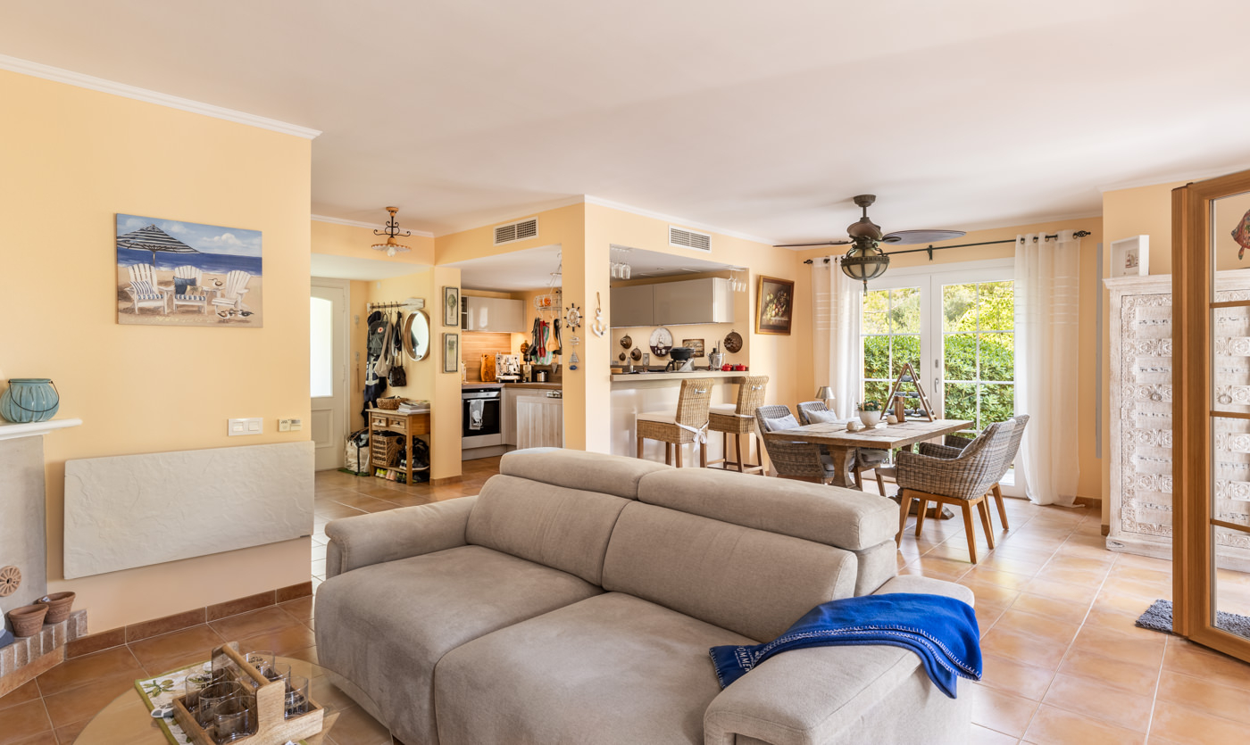 The approx. 145m² living space is spread over 2 floors. On the ground floor there is a bright, open-plan living area with fireplace and access to a spacious, covered terrace and the private garden, the fully equipped, modern kitchen open to the living room and a bathroom with shower. The master bedroom with en suite bathroom and French balcony, a further double bedroom and a single bedroom are located on the upper floor.