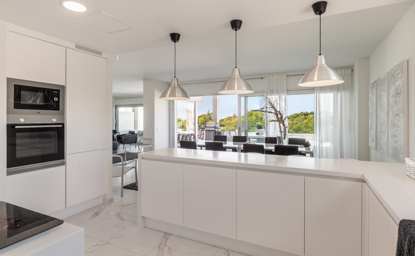 Lo más destacado es la gran terraza parcialmente cubierta de aprox. 85m² en planta. Aquí dispone de mucho espacio para comer al-fresco o tomar un refrescante aperitivo al atardecer mientras disfruta de las vistas a la vegetación y al mar.