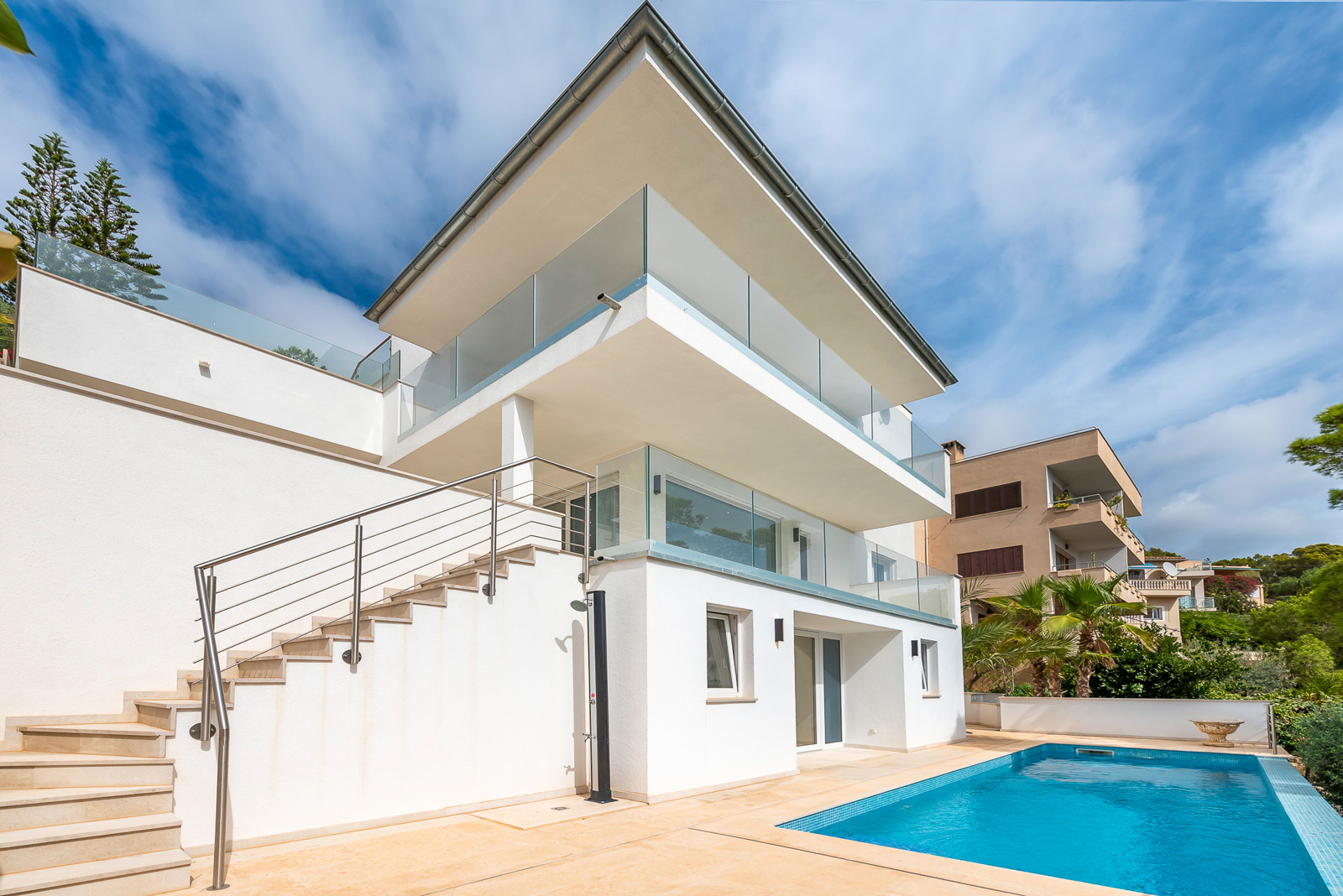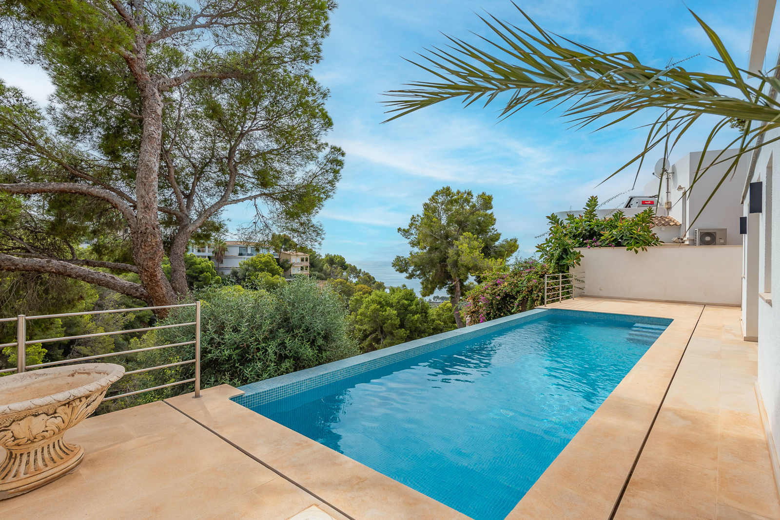 Esta villa con vistas al mar se encuentra en una parcela de aprox. 840 m² en Costa den Blanes en el suroeste de Mallorca. La casa renovada y completamente reformada con aprox. 250 m² de superficie habitable ofrece un luminoso salón, una moderna cocina americana con electrodomésticos Miele, 4 dormitorios y 4 baños en 3 plantas.