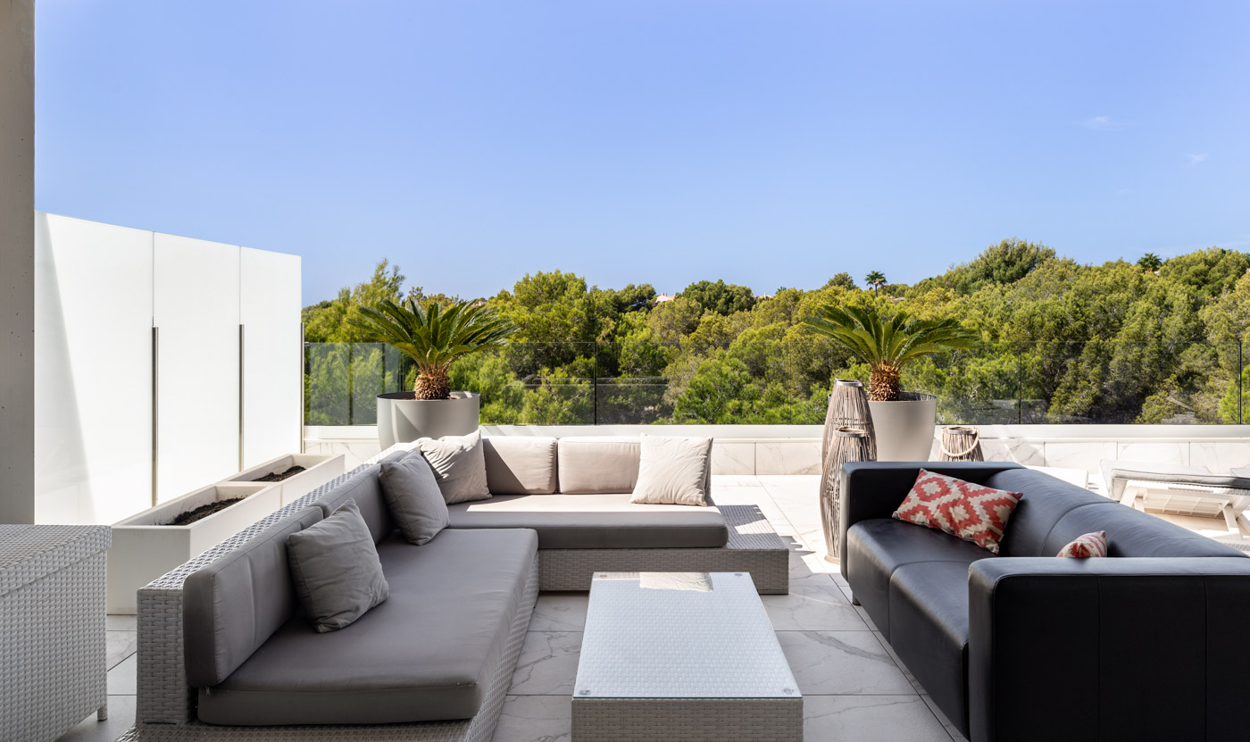 Das Highlight ist die ca. 85m² große, teilweise überdachte Terrasse auf der Wohnebene. Hier haben Sie viel Platz für al-fresco-dining oder chillige Sundowner während Sie den Blick ins Grüne bis hin zum Meer genießen.